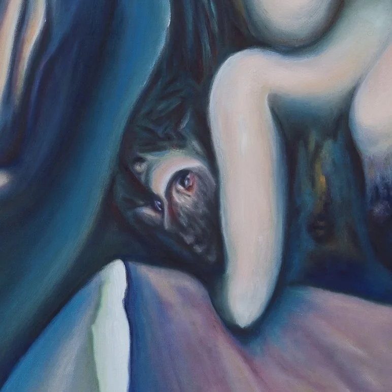 This series of works was created using Artificial Intelligence (AI). Images are printed on cotton canvas and oil painted. As with the rest of the practice, it is based on a tension between personal intuition and the involvement of technology as an external extension of a collective mind. The process is cyclical, with machine learning being performed repeatedly. For each image generation, the AI is fed photos of my completed works, which have been previously generated by the machine and painted. This process allows the AI to study my own works and reformulate them based on its experience. By increasing the textual input and shortening the time given for data processing, I address the AI in a way that challenges its generative logic, aiming to bring out its synthetic unconscious. The objective of this body of work is to expand the boundaries of painting by fully integrating the mechanical mind and organic body. This will be achieved by investigating the resulting subconscious visions in a shamanic manner.